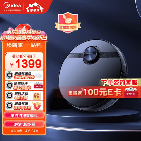 美的(Midea)M7耀石黑智能扫地机器人 激光导航 扫拖一体4000Pa大吸力 智能规划路线 APP控制到手价格1599.0元。